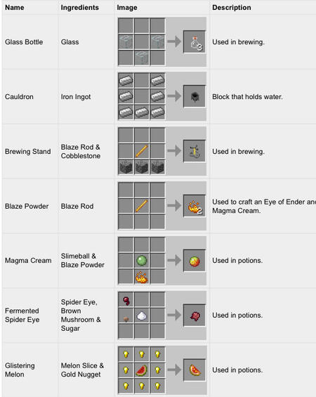 Fire Resistance: Nether wart -> Magma creamHealing: Nether wart -> Glistening melonNight Vision: Nether wart -> Golden carrotStrength: Nether wart -> Blaze powderRegeneration: Nether wart -> Ghast tearWater Breathing: Nether wart -> Pufferfish